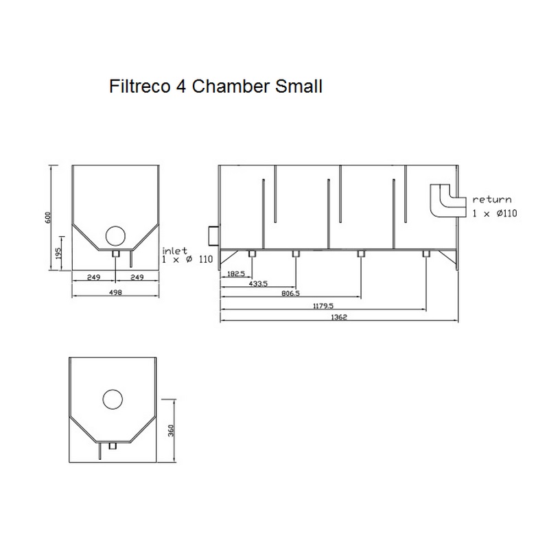 The filter consists of a 4-chamber tank in which water is pumped from the basin. The outlet of the filter being above the level of the basin, the water returns to the latter via a pipe whose slope allows the flow of the water towards the basin.