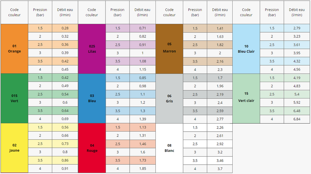Exemple: à 4 bars et une durée de rotation de 12 secondes, un tambour équipé d'une rampe de 4 buses de couleur marron va consommer 1,84 litres par rinçage.