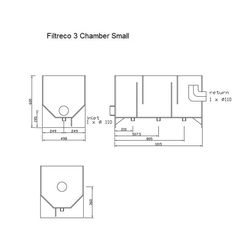 Le filtre se compose d’une cuve de 3 chambres dans laquelle l'eau est refoulée par une pompe depuis le bassin. La sortie du filtre étant située au-dessus du niveau du bassin, l'eau retourne vers ce dernier via un tuyau dont la pente permet l'écoulement de l'eau vers le bassin.