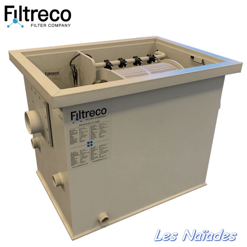 Elément comprenant un filtre à tambour et un filtre biologique. Mode gravitaire, version budget avec régulation simplifiée.
